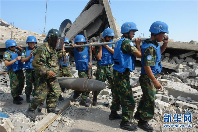 這張未注明拍攝日期的資料照片顯示的是中國維和部隊(duì)官兵在黎巴嫩南部轉(zhuǎn)移未爆航彈。 新華社發(fā)