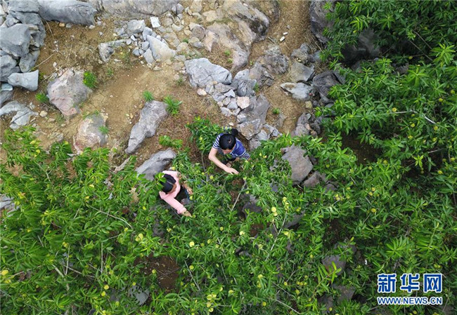 農(nóng)民在貴州省印江縣朗溪鎮(zhèn)昔蒲村的石漠化治理區(qū)采摘桃子(6月26日無人機拍攝)。 近年來,貴州省圍繞產(chǎn)業(yè)選擇、培訓農(nóng)民、技術(shù)服務(wù)、資金籌措、組織方式、產(chǎn)銷對接、利益聯(lián)結(jié)、基層黨建等“八要素”,通過“減、融、服”創(chuàng)新推進農(nóng)村產(chǎn)業(yè)結(jié)構(gòu)調(diào)整,既帶動了農(nóng)戶增收,也推動了特色產(chǎn)業(yè)做大做強。 新華社記者 楊文斌 攝