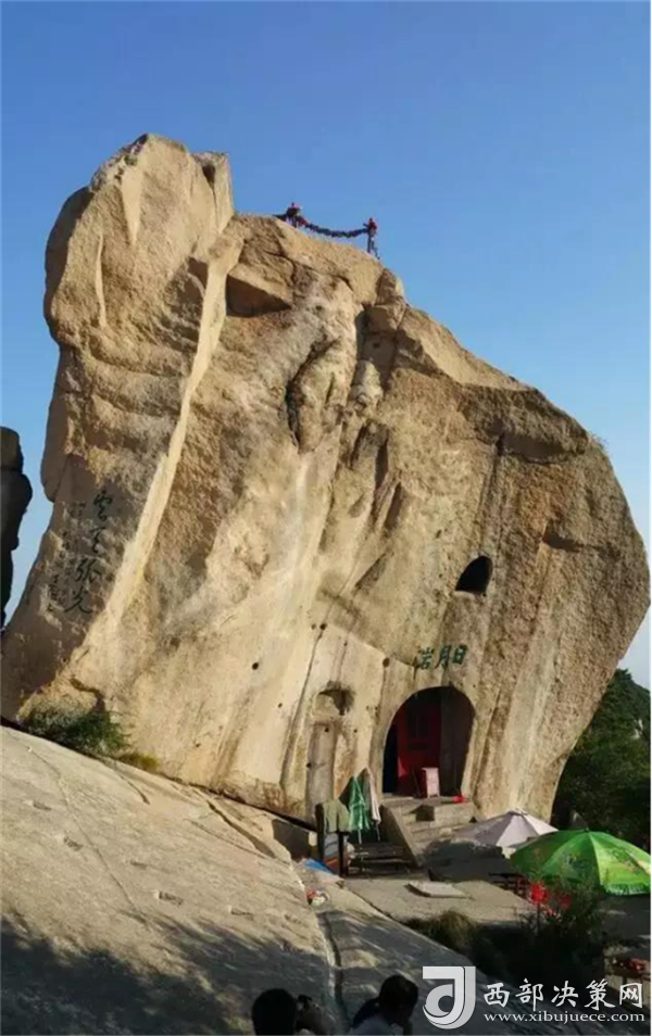 華山以石著名,每一處奇石都有一個(gè)美麗而動(dòng)人的傳說。過了擦耳崖,看到的這兩塊石頭叫“日月巖”,左邊的代表“日”,右邊的代表“月”,上面這四個(gè)字是“云天弧光”,有時(shí)在夜晚,這里會(huì)出現(xiàn)一道非常耀眼的光。相傳武則天當(dāng)年上華山走這里,看到這兩塊形似日月的石頭,就別出心栽地給自個(gè)兒的字號(hào)創(chuàng)造了一個(gè)“瞾”字,因?yàn)檫@兩塊奇石上頂青天,下臨空谷,唯我獨(dú)尊,是光明與權(quán)威的象征。