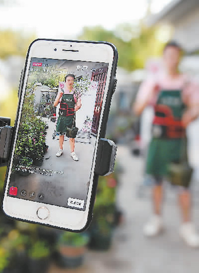 江蘇省宿遷市沭陽縣,一名花農(nóng)正在家門口直播銷售月季花。 新華社記者 李 響攝
