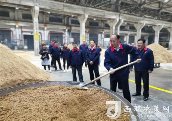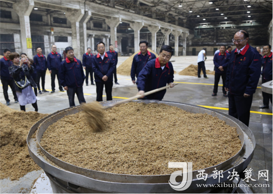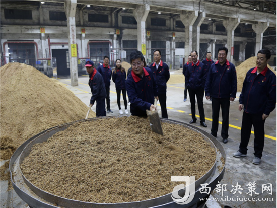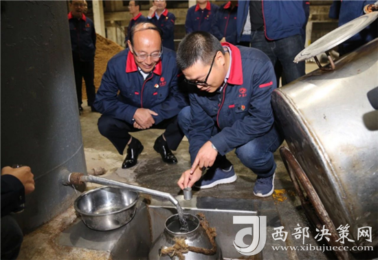 西鳳集團公司領(lǐng)導(dǎo)班子成員還詳細查看了窖池發(fā)酵情況,現(xiàn)場和工人師傅們一起裝甑餾酒,為大家鼓勁加油!