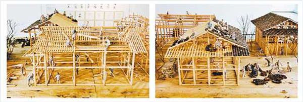 “作品分為動工、排扇、立架、安梁、上椽、排瓦、裝修、入住8個部分,再現(xiàn)了中國民間木匠的工藝傳統(tǒng)和中國傳統(tǒng)民居營建過程。”孫繼任介紹,為了讓作品呈現(xiàn)樸素而真實的美感,他們沒有在作品中運用釘子或者新材料。“作品全部是純手工制作,建筑為榫卯結(jié)構(gòu),人物是手工塑造并用木柴燒制而成。”
