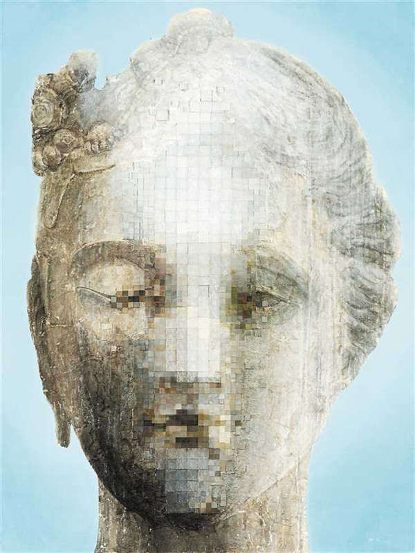 早在2017年,劉冠儒就開始制作以中西方雕塑為主題的綜合材料繪畫作品,《融》則是他首次將東西方雕塑的形象融為一體。作品中的“維納斯”頭像,左邊為東方形象,右邊為西方形象,中間是馬賽克。馬賽克部分由300多個大小不同的紙板粘貼而成,作者在紙板上面反復(fù)打磨和暈染,形成豐富的肌理效果。