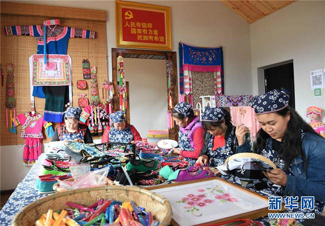 10月16日,團結村的幾名“巧媳婦”在刺繡。新華社記者 楊宗友 攝