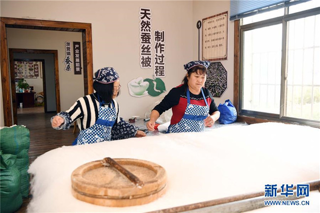 10月16日,團結村的“巧媳婦”龔粉珍(右)和張會敏在制作蠶絲被。 新華社記者 楊宗友 攝