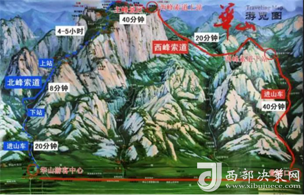 自古華山一條路(徒步上山)—北峰(華山論劍)—東峰(看日出,鷂子翻身)—南峰(煉丹爐、八卦池、長空棧道)—西峰(翠云宮、蓮花洞、巨靈足、斧劈石、舍身崖)—北峰(真武殿、玉女窗、老君掛犁處、鐵牛臺、等)—華山自古一條路或智取華山路(徒步下山)