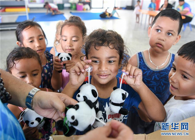 10月26日,在庫克群島首都阿瓦魯阿的阿皮尼考學(xué)校,幼兒園的孩子手拿來自中國(guó)的熊貓掛件。