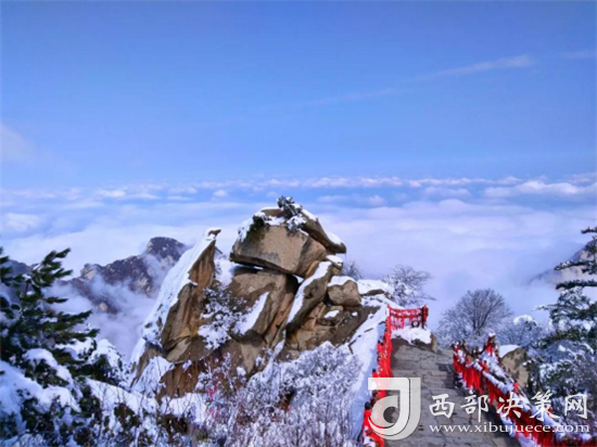 冬天華山的雪景不僅是銀白的世界,而是猶如千姿百態(tài)的雪雕。有“林海玉樹(shù)”、“雪堆玉石”、“云中雪龍”、“巖崖雪屋”、“梨花飛揚(yáng)”、“天女散花”、“紅帶玉墜”等各具形態(tài)的奇特景觀。矗立北峰,望山外三峰及四周,那華山的雪,層層疊疊,覆蓋著起伏的山巒,天地間一片蒼茫。又或遇大雪漫天飛舞,鋪天蓋地,天地間一片潔白。