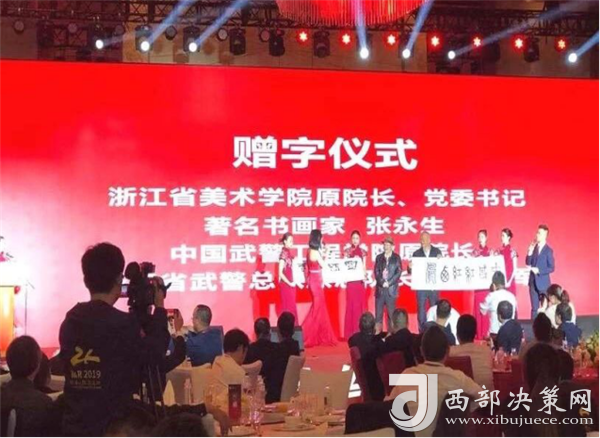 浙江省美術(shù)學(xué)院原院長、黨委書記、著名書畫家——張永生,浙江省武警總隊(duì)原總隊(duì)長何虎少將現(xiàn)場贈字,西鳳股份公司副董事長、總經(jīng)理賈智勇上臺接受贈字。