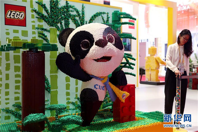 11月3日,在品質(zhì)生活展區(qū)的樂(lè)高展臺(tái),用積木搭成的進(jìn)博會(huì)吉祥物熊貓“進(jìn)寶”已安裝就緒。新華社記者劉穎攝