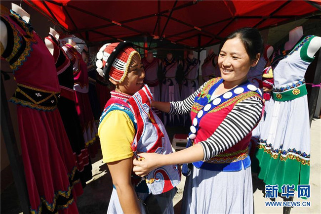 11月2日,云南福貢縣鹿馬登鄉(xiāng)干布村的傈僳族婦女阿白(右)在展示自己手工制作的服飾。阿白靠傳統(tǒng)服飾制作每年可收入三萬多元。新華社記者 楊宗友 攝