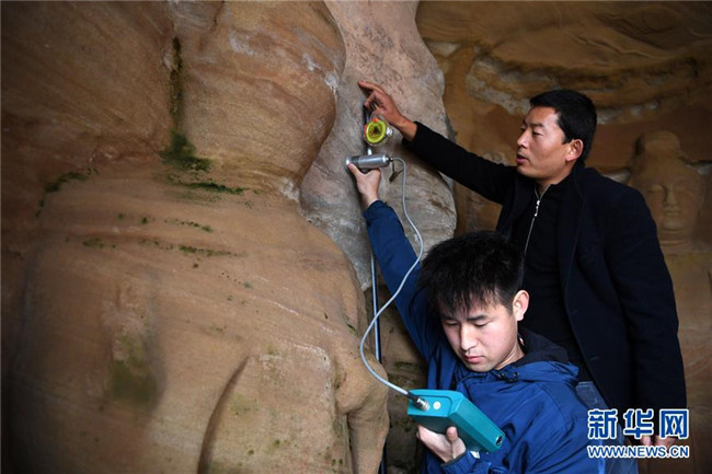 11月5日,在甘肅省慶陽市北石窟寺267窟,敦煌研究院北石窟寺文物保護(hù)研究所工作人員在檢測(cè)記錄巖體含水率。 新華社記者 馬寧 攝