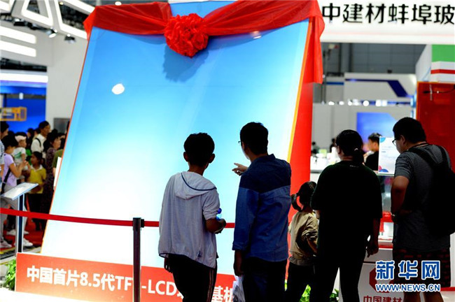 觀眾在2019世界制造業(yè)大會(huì)上參觀中國首片8.5代TFT-LCD玻璃基板(9月22日攝)。 新華社發(fā)(黃博涵攝)