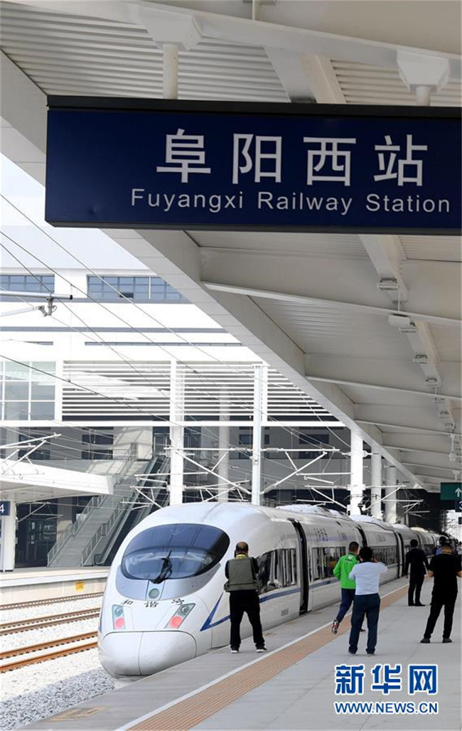 10月24日,一輛試運(yùn)行列車停靠在商合杭高鐵阜陽西站。 新華社記者劉軍喜攝