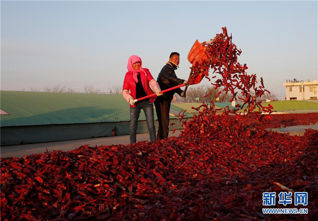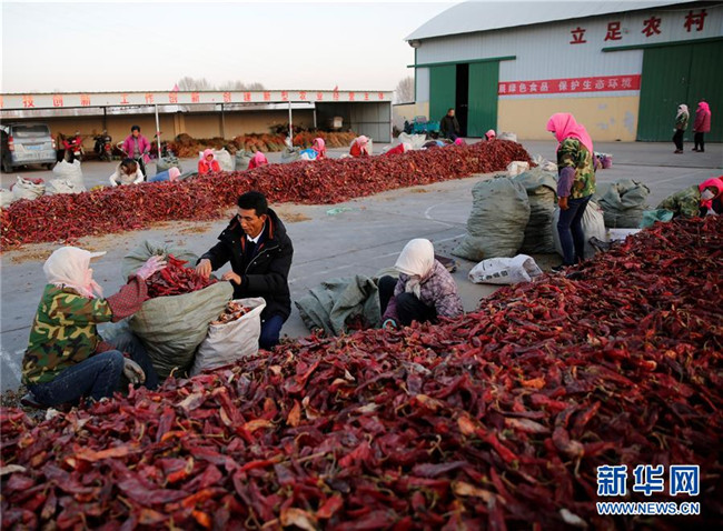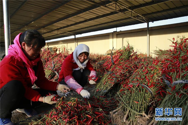 初冬時節(jié),甘肅省金昌市永昌縣水源鎮(zhèn)的村民們利用農(nóng)閑來到附近的辣椒加工廠打工,在家門口就業(yè)增收,每位村民每天可以增加100元左右的收入。