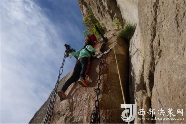 長(zhǎng)空棧道:“長(zhǎng)空棧道”可謂華山險(xiǎn)道之首,它尤如一道奇異的仙練鑲嵌在南峰絕壁。明代“后七子”之一的李攀龍《太華山記》載:“出南天門向西就是棧道,棧雖有銅柱鐵索攔護(hù),然闊不盈尺。行二十余丈方至盡頭。下折為井,高約三丈,旁出復(fù)為棧……”置身其中,直覺背空腳虛,發(fā)豎氣閉,寒風(fēng)沖襠,骨松筋緊,膽大者有凌空欲飛之感,膽弱者心生抵近鬼門之憂。多少年來“長(zhǎng)空棧道”以它特有的絕險(xiǎn)情懷召喚著天下英雄豪杰一試身手,體驗(yàn)驚心動(dòng)魄,揮灑豪邁人生。