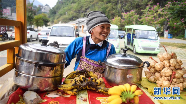 這是廣西凌云縣浩坤村群眾在景區(qū)擺放水果等食品接待游客(11月24日攝)。新華社記者張愛林