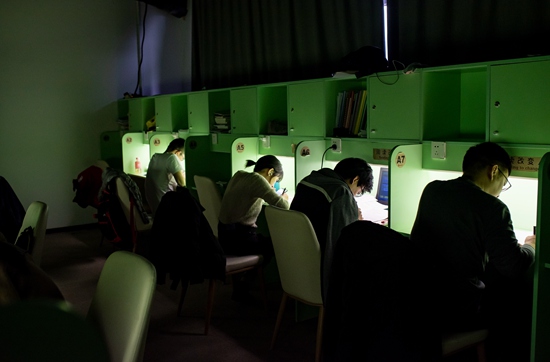 11月22日,北京中關(guān)村一家付費自習(xí)室內(nèi),顧客在“暗室”中學(xué)習(xí)。正值考研季,付費自習(xí)室里的多數(shù)顧客都是為考研而來。
