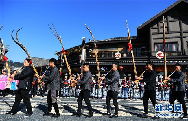 12月7日,苗族群眾在丹寨縣“祭尤節(jié)”活動上吹奏蘆笙。新華社記者 楊文斌 攝