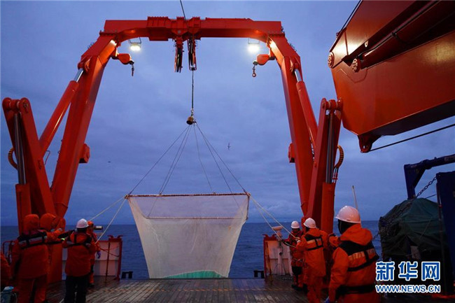 “雪龍2”號12月7日離開南大洋普里茲灣海域向西航行,開始對宇航員海海域展開科考作業(yè)。科考隊(duì)員沿著本次宇航員??瓶嫉氖讉€調(diào)查斷面,自北向南做了多個站位的CTD(海水溫鹽深測量儀)采水作業(yè)、浮游生物垂直拖網(wǎng)作業(yè),以及魚類拖網(wǎng)和箱式采樣器等采樣作業(yè)。