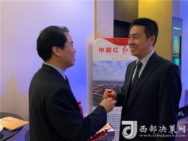 陜西西鳳酒營(yíng)銷管理公司海外市場(chǎng)負(fù)責(zé)人閆紅斌代表企業(yè)向泰國(guó)國(guó)務(wù)院前副總理、泰中友好協(xié)會(huì)會(huì)長(zhǎng)功·塔帕郎西贈(zèng)送紅西鳳酒