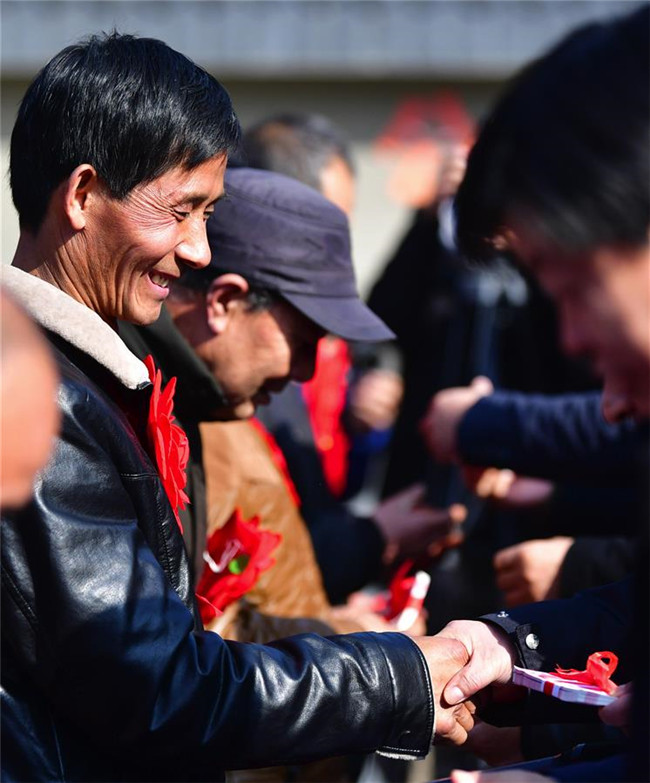 1月7日,村民尹新平在分紅大會上領到“致富能手獎”。 新華社記者 陳斌 攝