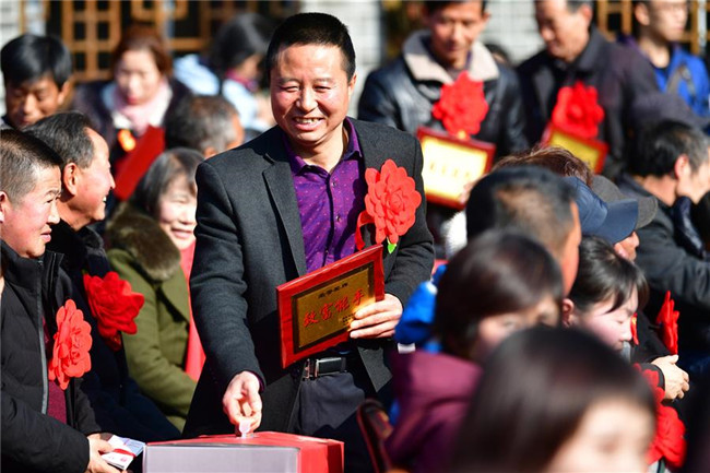 1月7日,稻坪村黨支部書記尹守明在分紅大會上領取村集體分紅。新華社記者 陳斌 攝
