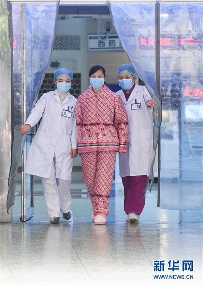 1月29日,在重慶三峽中心醫(yī)院,醫(yī)護人員護送治愈患者蔣某(中)出院。 新華社記者王全超攝