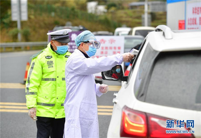 在廣西龍勝各族自治縣高速公路收費(fèi)站出口,粟萬龍(右)對過往人員進(jìn)行體溫檢測(2月8日攝)。