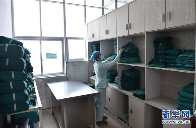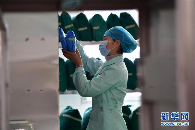 在廣西龍勝各族自治縣人民醫(yī)院,粟萬龍的妻子楊紅英在整理醫(yī)療物資(2月8日攝)。