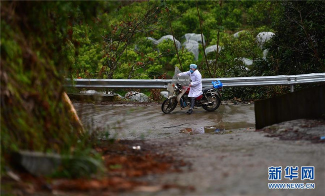 在廣西龍勝各族自治縣樂江鎮(zhèn)涼坪村,粟萬龍的哥哥粟從軍騎車上路,準(zhǔn)備發(fā)放疫情防控宣傳材料(2月8日攝)。