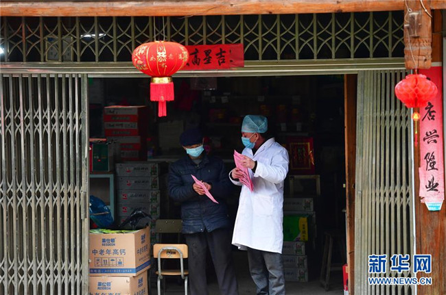 在廣西龍勝各族自治縣樂江鎮(zhèn)涼坪村,粟萬龍的哥哥粟從軍(右)向村民發(fā)放疫情防控宣傳資料(2月8日攝)。