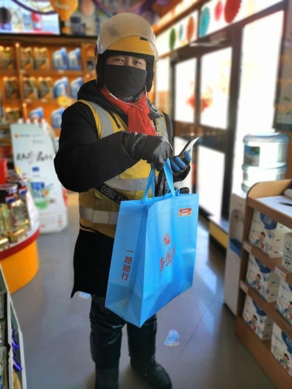 榆陽佳能加油站員工霍靜迅速拿起手機(jī)確認(rèn)訂單,欣喜若狂,將商品依次消毒放入昆侖好客打包袋等待快遞小哥取單。因?yàn)槭巧暇€的第一單,特意在打包袋里面裝有溫馨提示小紙條:“戴口罩、勤洗手,中國加油!武漢加油!中國石油與您同在!”