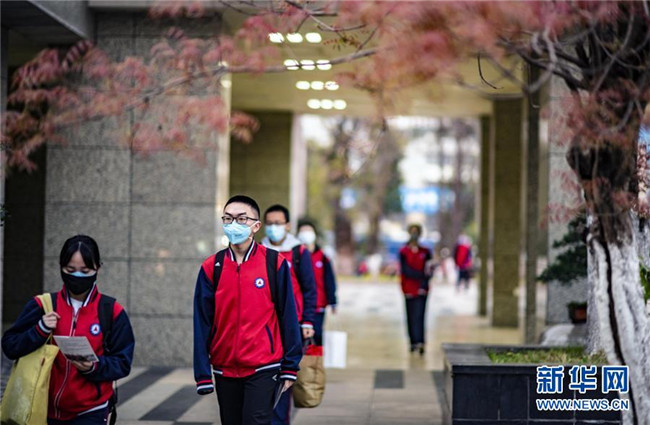3月23日,昆明市第一中學(xué)高三年級的學(xué)生進(jìn)入校園準(zhǔn)備上課。新華社記者 江文耀 攝