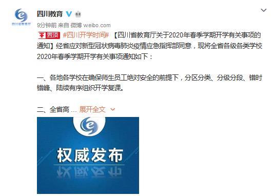 《通知》稱,經(jīng)四川省應(yīng)對(duì)新型冠狀病毒肺炎疫情應(yīng)急指揮部同意,現(xiàn)將全省各級(jí)各類學(xué)校2020年春季學(xué)期開學(xué)有關(guān)事項(xiàng)通知如下: