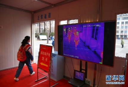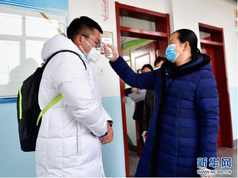 3月9日,在青海省海東市第二中學(xué),學(xué)生進(jìn)入教室前進(jìn)行測(cè)溫。