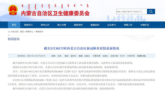 2020年3月29日7時(shí)至30日7時(shí),內(nèi)蒙古自治區(qū)報(bào)告新增境外輸入新冠肺炎確診病例2例、疑似病例7例。