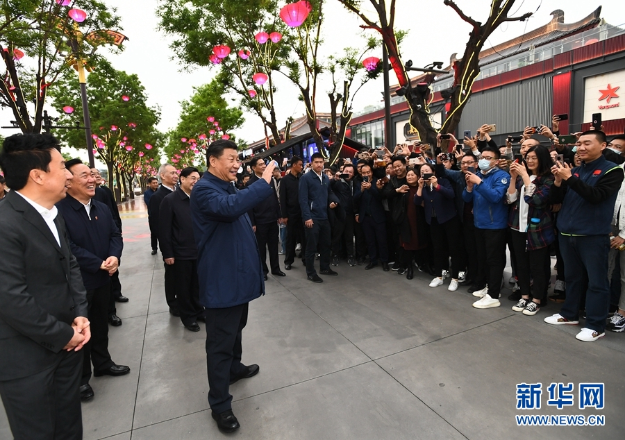 4月20日至23日,中共中央總書(shū)記、國(guó)家主席、中央軍委主席習(xí)近平在陜西考察。這是4月22日,習(xí)近平在西安大唐不夜城步行街考察時(shí),向游客揮手致意。 新華社記者 謝環(huán)馳 攝
