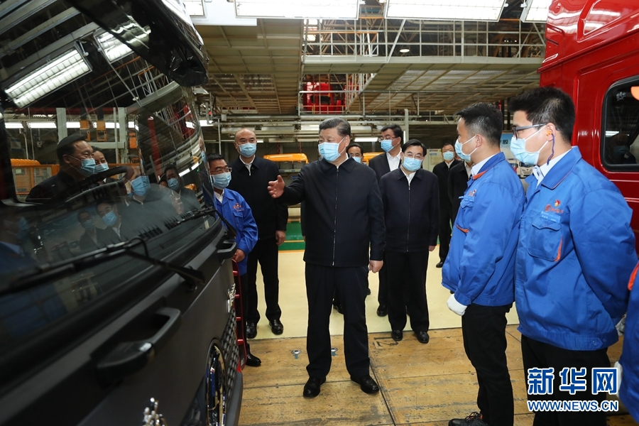 22日,習(xí)近平在西安考察復(fù)工復(fù)產(chǎn)和經(jīng)濟(jì)社會(huì)恢復(fù)運(yùn)行等情況。陜西汽車(chē)控股集團(tuán)有限公司是西北地區(qū)有影響力的制造企業(yè)。習(xí)近平詳細(xì)了解產(chǎn)品研發(fā)、生產(chǎn)、銷(xiāo)售和復(fù)工復(fù)產(chǎn)情況,對(duì)他們克服疫情影響創(chuàng)產(chǎn)銷(xiāo)歷史新高表示贊賞??傃b車(chē)間內(nèi)一片繁忙景象。習(xí)近平察看內(nèi)飾生產(chǎn)線、總裝配生產(chǎn)線,饒有興致登上裝配完成的民用重型卡車(chē)駕駛室,向技術(shù)人員詢問(wèn)產(chǎn)品性能和操作流程。習(xí)近平強(qiáng)調(diào),制造業(yè)是國(guó)家經(jīng)濟(jì)命脈所系。國(guó)有大型企業(yè)要發(fā)揮主力軍作用,在抓好常態(tài)化疫情防控的前提下,帶動(dòng)上下游產(chǎn)業(yè)和中小企業(yè)全面復(fù)工復(fù)產(chǎn)。習(xí)近平指出,新時(shí)代陜西要有勇立潮頭、爭(zhēng)當(dāng)時(shí)代弄潮兒的志向和氣魄,既要抓住西部大開(kāi)發(fā)、共建“一帶一路”等重大機(jī)遇,又要善于從眼前的危機(jī)和挑戰(zhàn)中搶抓和創(chuàng)造機(jī)遇,不斷發(fā)展新模式、新業(yè)態(tài)、新技術(shù)、新產(chǎn)品,創(chuàng)造新的更大業(yè)績(jī),邁上新的臺(tái)階。
