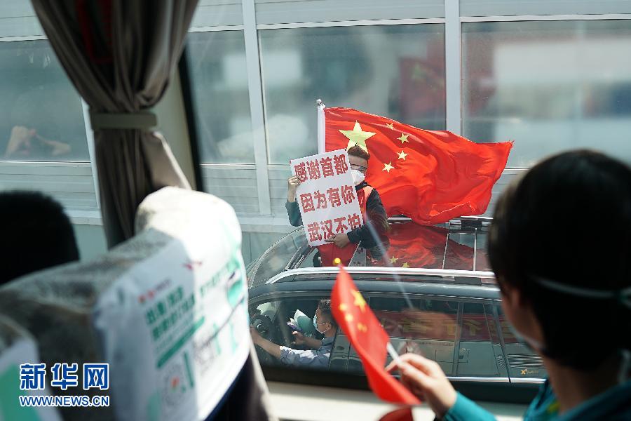 歡送的人群舉著橫幅——“感謝北京,因?yàn)橛心?,武漢不怕”“致敬最美逆行者”等標(biāo)語(yǔ)在陽(yáng)光下閃動(dòng)。