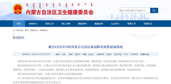 4月27日,記者從內(nèi)蒙古自治區(qū)衛(wèi)生健康委員會獲悉,2020年4月26日7時至4月27日7時,內(nèi)蒙古自治區(qū)報告無新增確診病例、疑似病例。治愈出院8例(均由滿洲里市口岸入境)。