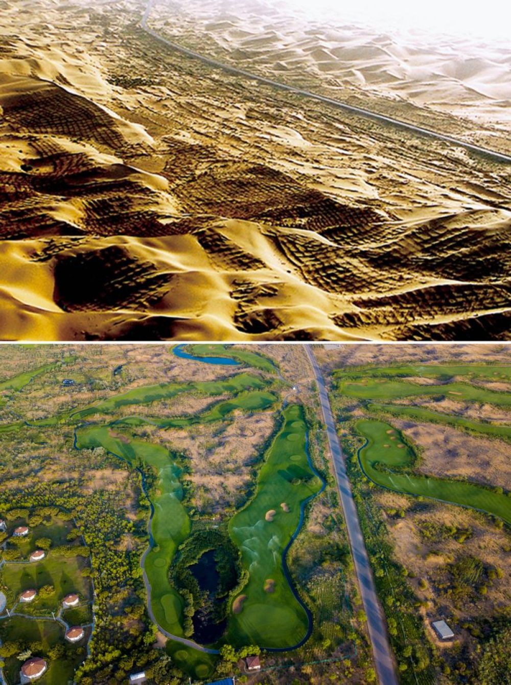 拼版照片:上圖為20世紀末的內(nèi)蒙古鄂爾多斯市杭錦旗庫布其沙漠(資料照片);下圖為庫布其沙漠生態(tài)公園的景色(新華社記者彭源2018年7月11日無人機拍攝)。新華社發(fā)