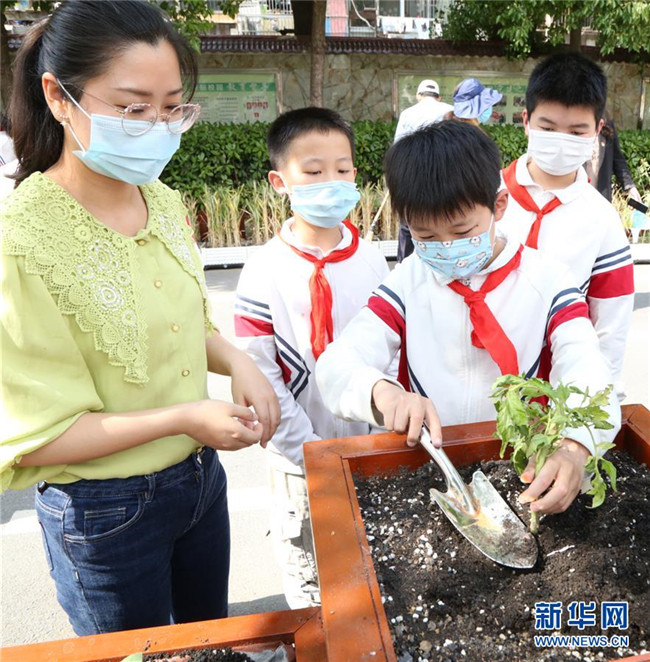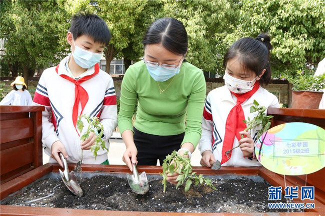 4月29日,在安徽省合肥市臨泉路第二小學(xué),學(xué)生在班級“責(zé)任田”里栽種農(nóng)作物幼苗。新華社發(fā)(傅軍 攝)