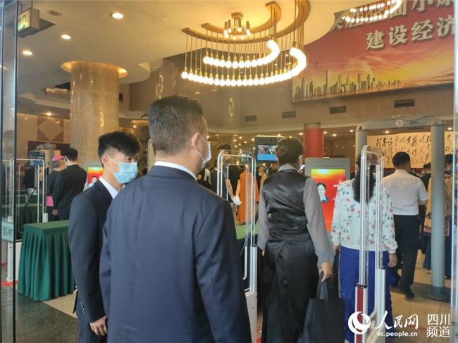 進入會場前,委員們在安檢通道接受紅外線測溫儀體溫檢測。郭瑩攝