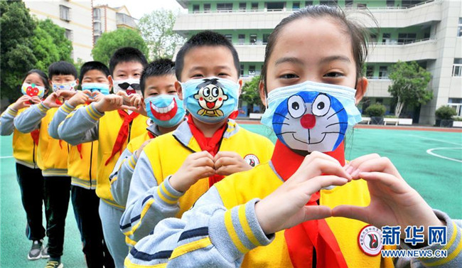 5月8日,安徽省安慶市迎江區(qū)華中路第二小學(xué)在操場(chǎng)上開展手繪“微笑口罩”創(chuàng)意活動(dòng),通過讓孩子們手繪各式笑臉并貼到口罩上的方式,引導(dǎo)學(xué)生培養(yǎng)健康樂觀的心態(tài)。 當(dāng)日是世界微笑日。 新華社發(fā)(黃有安 攝)