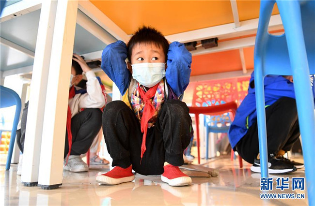5月10日,合肥市淝南社區(qū)的兒童在進(jìn)行地震防災(zāi)應(yīng)急避險演練。 新華社記者 劉軍喜 攝