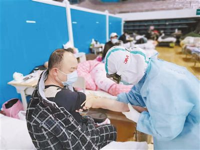 對(duì)于護(hù)理醫(yī)療隊(duì)的隊(duì)員們來(lái)說(shuō),在洪山體育館武昌方艙醫(yī)院的每一天,都是那么緊張。護(hù)理人員需快速對(duì)新入院的患者實(shí)施入院流程管理,觀察病情、監(jiān)測(cè)病人生命體征,及時(shí)將不適合入院的患者分診出轉(zhuǎn)至定點(diǎn)醫(yī)院;在為患者做好血氧監(jiān)測(cè)、體溫監(jiān)測(cè)等??谱o(hù)理的同時(shí),還包攬了喂飯、喂藥、翻身、擦洗、換衣、大小便管理等各種貼身護(hù)理工作。這些看起來(lái)簡(jiǎn)單的工作,卻因?yàn)橐诜雷o(hù)服、口罩、護(hù)目鏡等防護(hù)裝備的層層包裹下進(jìn)行,變得異常吃力。最忙的時(shí)候,3個(gè)護(hù)士要同時(shí)護(hù)理82名患者,但隊(duì)員們憑著自身過(guò)硬的護(hù)理經(jīng)驗(yàn),攻克了一個(gè)又一個(gè)難關(guān)。
