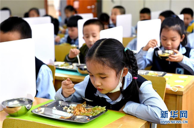 5月11日,陜西省西安市新城區(qū)后宰門小學一年級的學生在吃午飯。新華社記者 劉瀟 攝