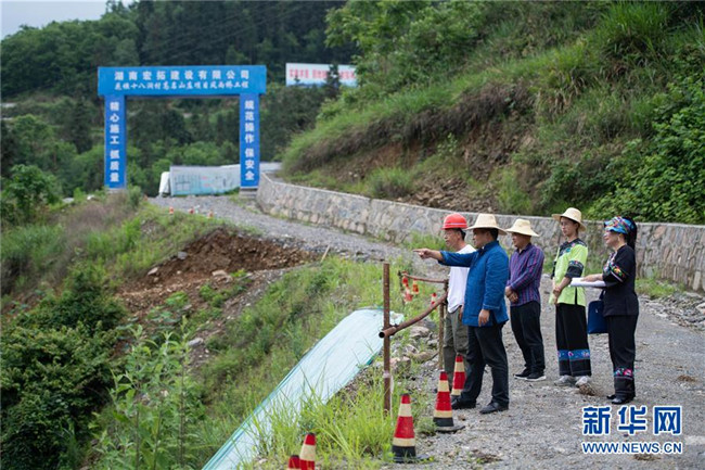 5月15日,在湘西十八洞村溶洞開(kāi)發(fā)工地,麻輝煌(左二)和村干部進(jìn)行施工規(guī)劃。新華社發(fā)(陳思汗攝)