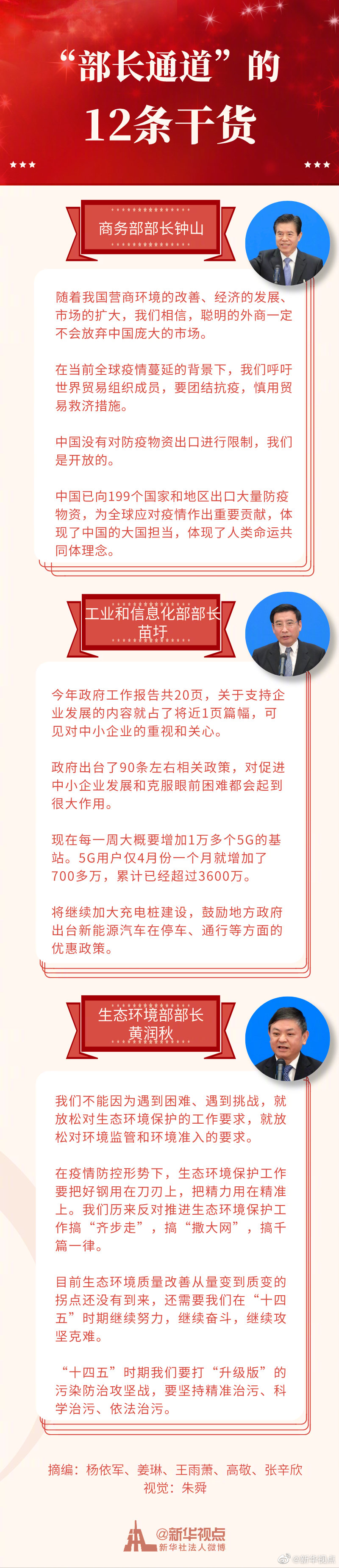 原標題:今天的“部長通道”,12條干貨! 5月25日,商務部部長鐘山、工業(yè)和信息化部部長苗圩、生態(tài)環(huán)境部部長黃潤秋亮相全國兩會“部長通道”。新華視點微博為你總結(jié)了12條干貨,請看↓
